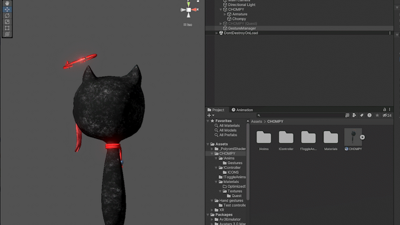 Creator Companion (New Project) -> Poiyomi -> Unity Package -> Open (CHOMPY) scene